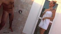 I bet he didn't expect that ... When I came through the door, only dressed in a towel, he was in the shower. So lucky to meet him here because I noticed him before checking in. I open my towel in front of his eyes, show him my naked body, come up to him, kiss him and grab his cock. Oh he makes me so hot and my pussy so wet! The fact that people are watching us from below only makes me hornier!